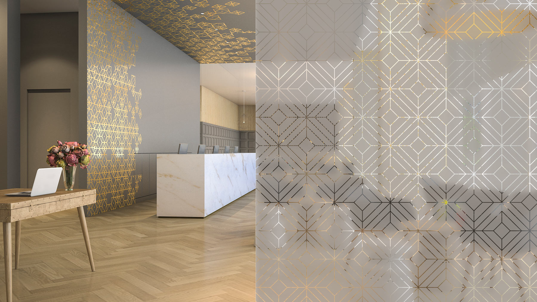 Konturgeschnittene Sandstrahlfolie mit seidenmatter, transparenter Oberfläche für die Verklebung auf Glas – vermittelt den Eindruck einer sandgestrahlten Oberfläche. Wird auch als Glasdekorfolie oder Satinatorfolie bezeichnet.