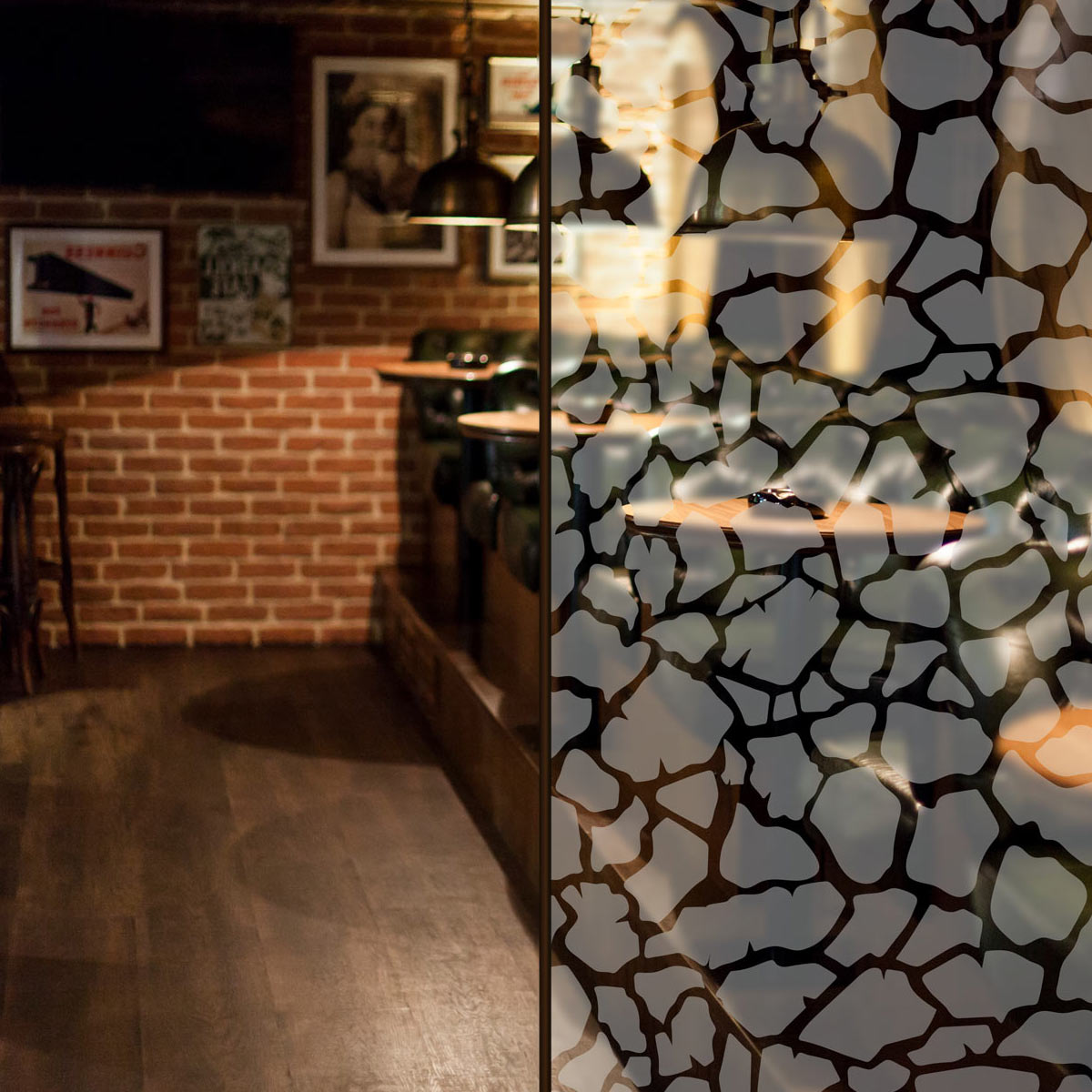 Konturgeschnittene Sandstrahlfolie mit seidenmatter, transparenter Oberfläche für die Verklebung auf Glas – vermittelt den Eindruck einer sandgestrahlten Oberfläche. Wird auch als Glasdekorfolie oder Satinatorfolie bezeichnet.