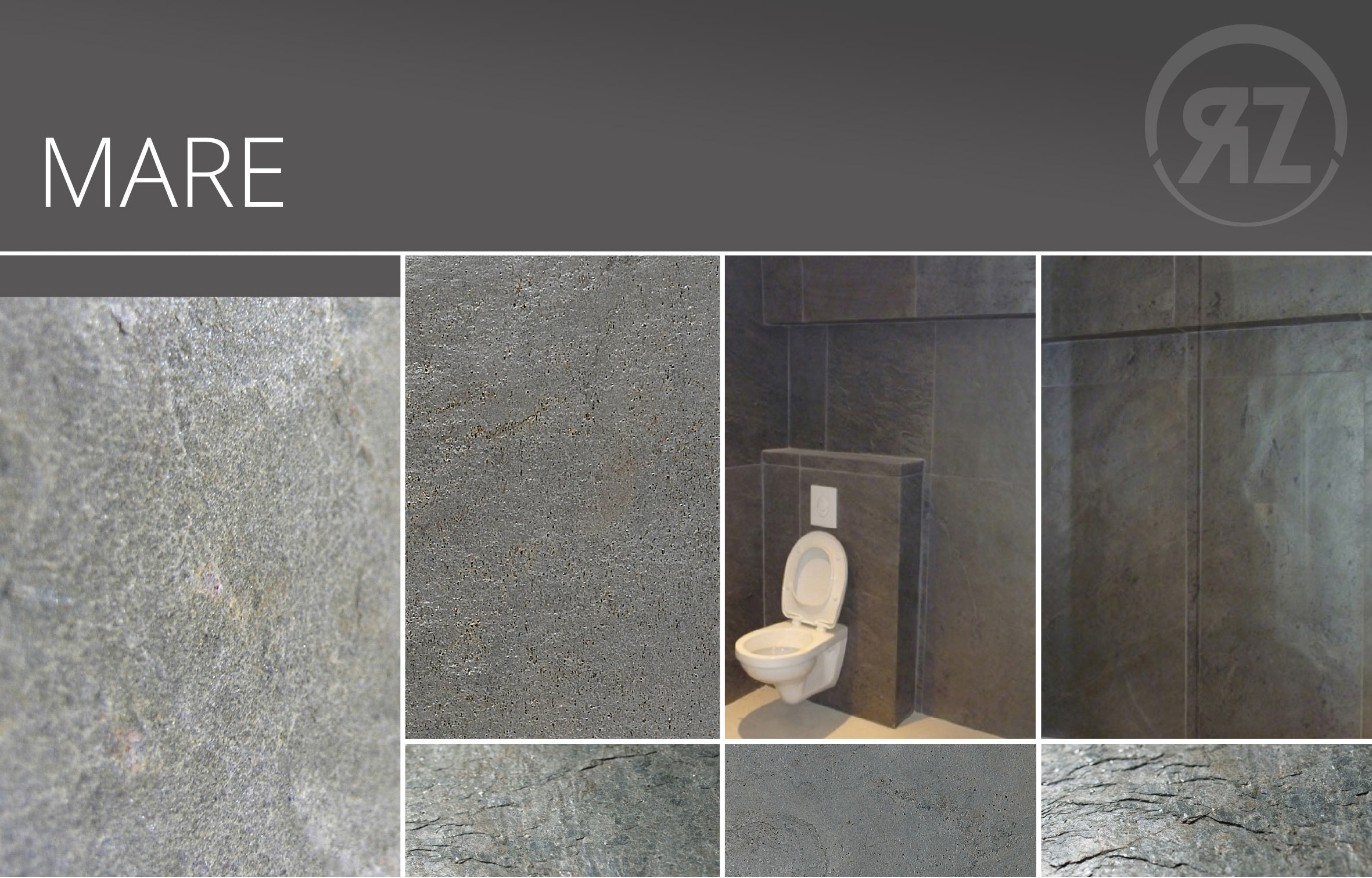 Mare ist ein Glimmerschieferdekor mit einer echten Steinoberfläche. Der besondere Glimmereffekt entsteht durch einen erhöhten Anteil an Feldspat. Insgesamt ist die Oberfläche härter und weist eine stärkere Struktur auf, somit eignet sich dieses Material besonders für Wände als auch für Fußböden. Meistens bleibt der Glimmerschiefer sehr farbstabil in der Maserung der Oberfläche.